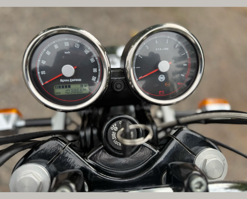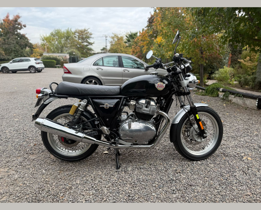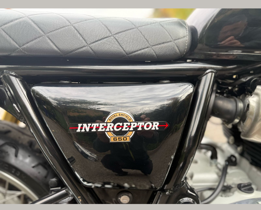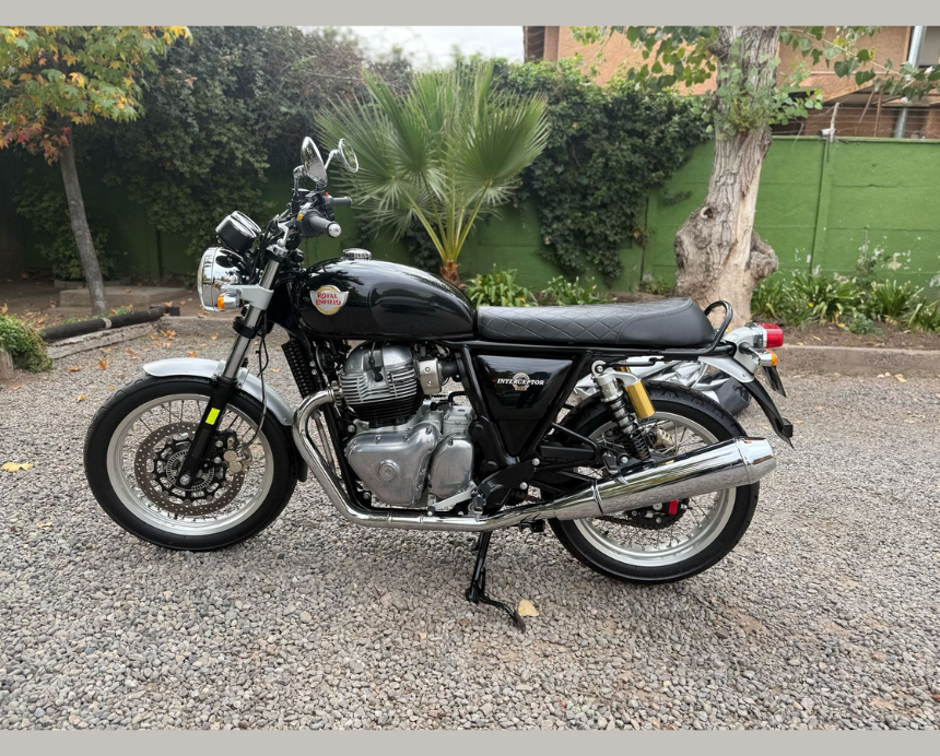 Versión Interceptor 650 con asiento tapizado tipo rombo, doble escape cromado, tablero analógico con pantalla digital y detalles en negro que realzan su estética vintage.
